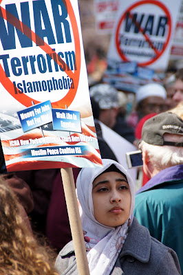 I was honored to march yesterday holding a banner with Pardiss Kebriaei who advocates for prisoners in limbo at Guantanamo, and two school age girls in headscarves whose mom and dad walked behind and popped snacks into their mouths like birds. The UNAC banner we carried said: Stop Government Attacks On Unions, Muslims, Immigrants and Communities of Color. On this day the NYPD was on its best behavior, and the legions of officers were polite and respectful in their attempts to keep us on one half of Broadway while the hipster shopping crowd had their phones out snapping away, looking at us like they had never seen a protest march before. Maybe it was the legions of moms, dads, kids, grandmas and grandpas that had turned out to represent for the Muslim peace community. Such a variety of clothing, languages, chants and messages. One handmade sign read: Islam Means Peace.