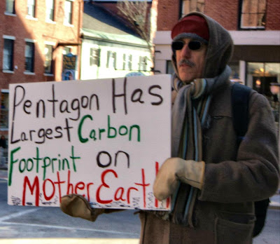 | Bruce Gagnon at Portland No Tar Sands march Sat. Jan 26, 2013. Full story of the Pentagon's carbon footprint may be found in The Green Zone: The Environmental Costs of Militarism by Barry Sanders. |